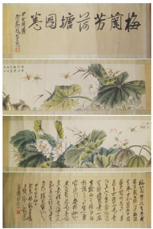 在馬維衡家中,他拿出了這幅珍貴的梅蘭芳手卷。展開一看,手卷長(zhǎng)近4米,盡管年代久遠(yuǎn),但因主人保管得當(dāng),畫面上的顏色還是青翠欲滴。整幅畫卷看上去清新淡雅,荷花荷葉錯(cuò)落有致。畫卷原本略長(zhǎng),但是在中間部位,點(diǎn)綴起幾只動(dòng)態(tài)的蜻蜓,立刻就盤活了整幅畫卷,生機(jī)盎然起來。特別是梅蘭芳在綠色荷葉上的處理,更是濃淡皆宜,水墨洇染,顯示了深厚的中國(guó)水墨畫功底。在長(zhǎng)卷的首尾處,都有當(dāng)代書法大家徐利明所題字,他也盛贊這幅畫作“皆入專家法門,無稍遜也。”