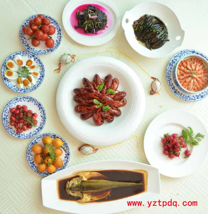 每到端午節(jié)的這一天,揚州人家中午一定要回家“嘗午”。所謂“嘗午”就是吃十二紅,是揚州人過端午節(jié)特有的習俗。“十二紅”是指十二樣自然紅色,或經(jīng)烹調(diào)后顏色發(fā)紅的時令菜肴,通常有咸鴨蛋、煮黃魚、粉皮拌黃瓜、炒蝦子、炒紅莧菜、燒仔鵝、洋花蘿卜、櫻桃、枇杷、紅杏、干菜燒肉、炒長魚、紅燒扒蹄、火腿、香腸、雄黃酒等。一般分為4碗8碟,即4個涼拌,4個熱炒,4個燒菜。這個數(shù)字代表每年的十二個月,再者它也兼顧了每年的四時八節(jié)。